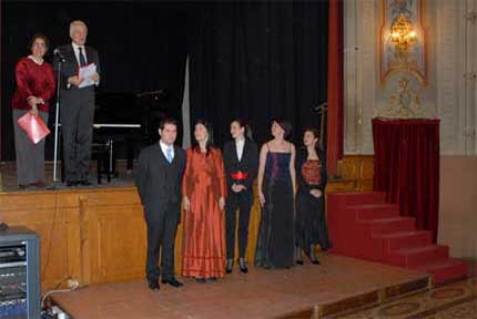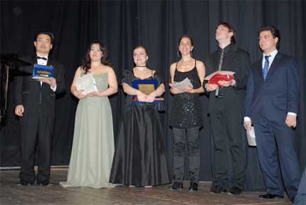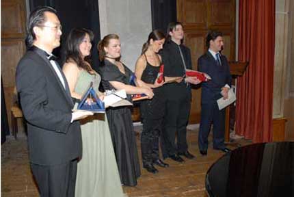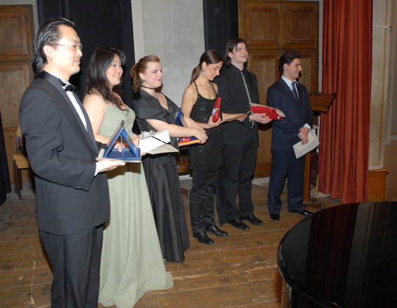 Paolo Coni e Roberta Pedrotti consegnano il premio come giovane promessa a Silvia Regazzo, dietro Mauro Trombetta. Sotto, da sinistra, Evgeniy Libermann. Yasko Sato, Salvador Rivas, Silvia Beltrami.