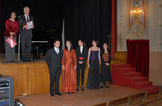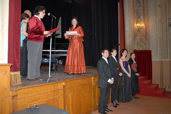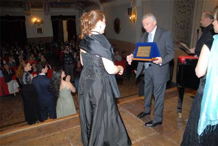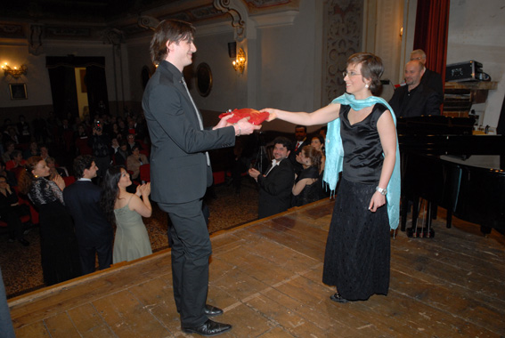 Sandro Zanetti consegna la targa come migliore interprete femminile a Silvia Beltrami, a destra Roberta Pedrotti e Paolo Coni; sotto da sinistra Olga Kotlyarova, Evgeniy Libermann e Yasko Sato.